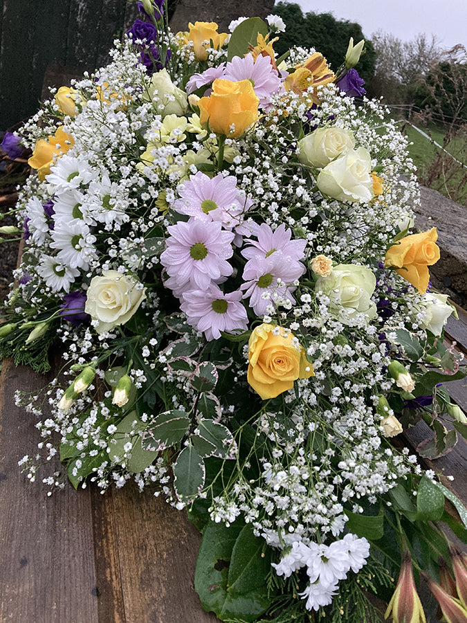 By using flowers, in sympathy, colours are important as they can soften or brighten the service. You may want to use bright, mixed colours in order to brighten up the service and reflect on the better times or you may wish to use subtle, calm colours of pastel hues. I would be happy to help you choose the right flowers in order to create beautiful tributes.