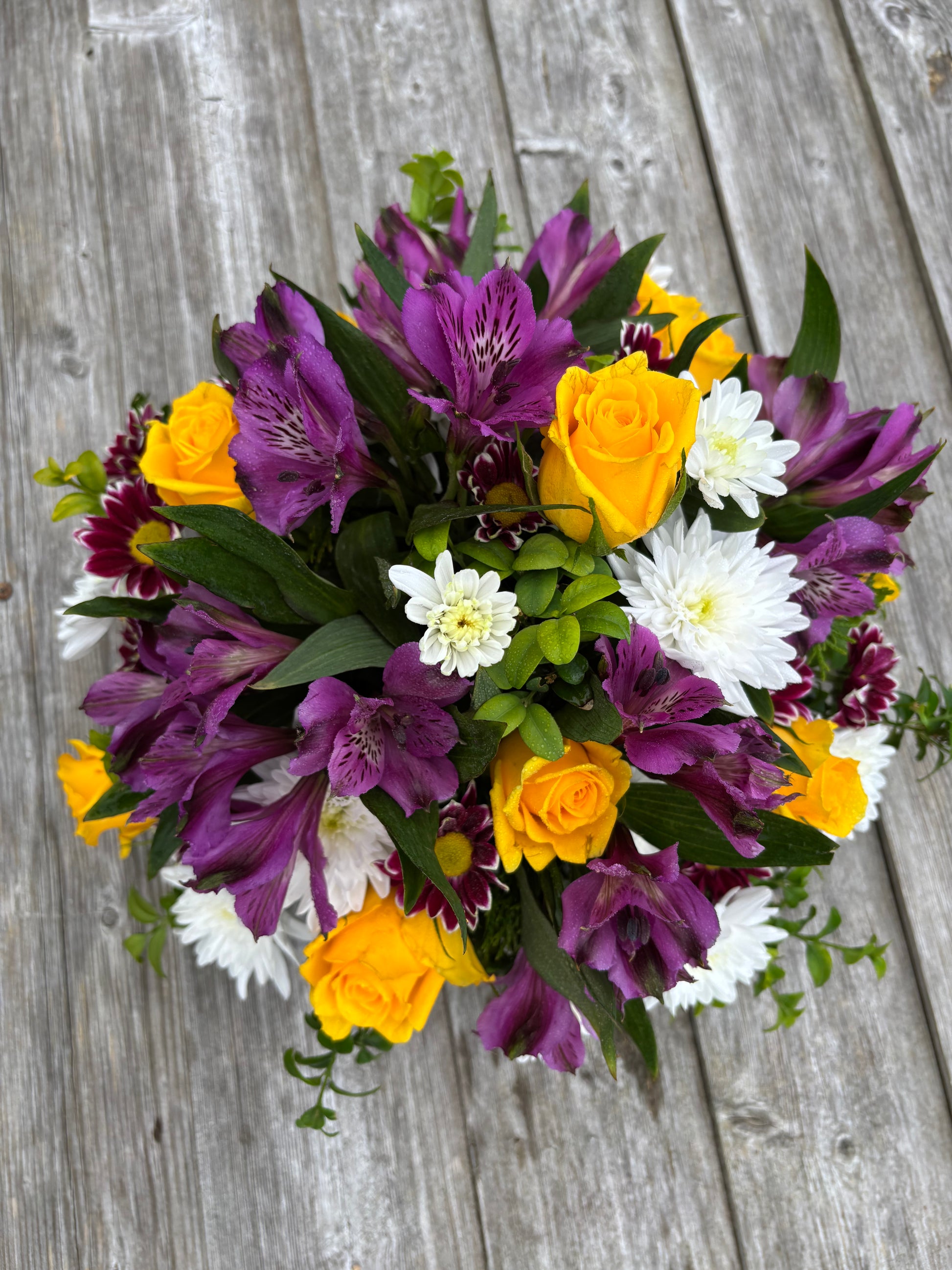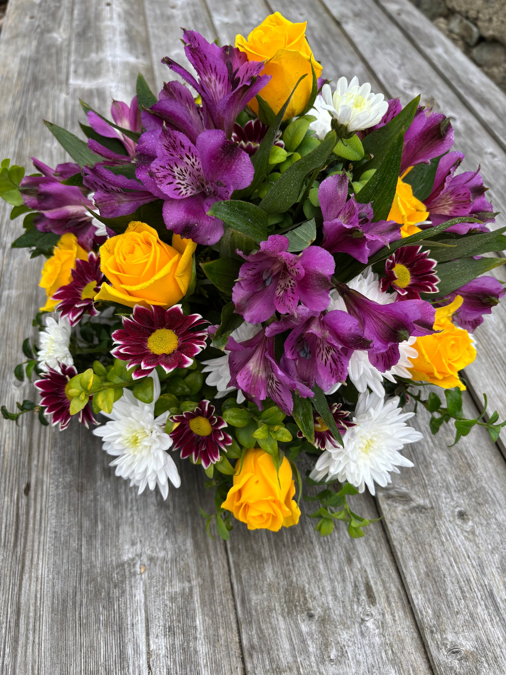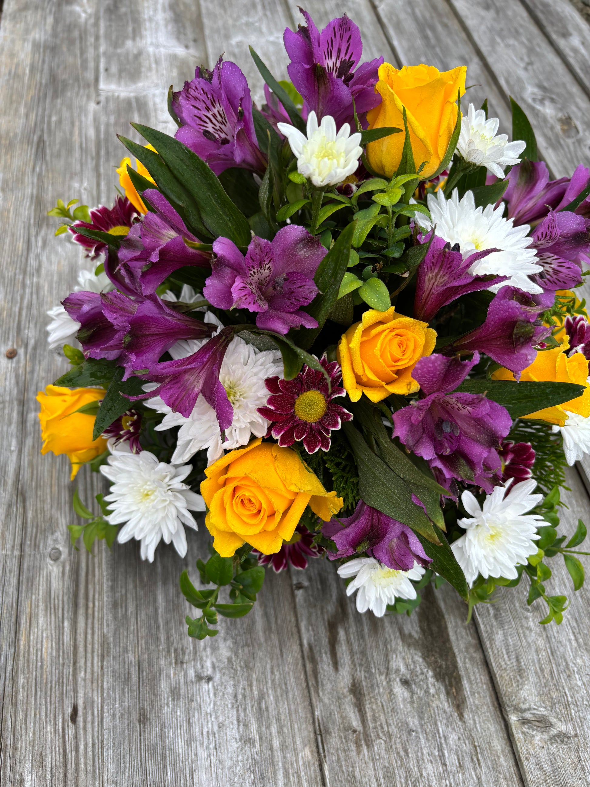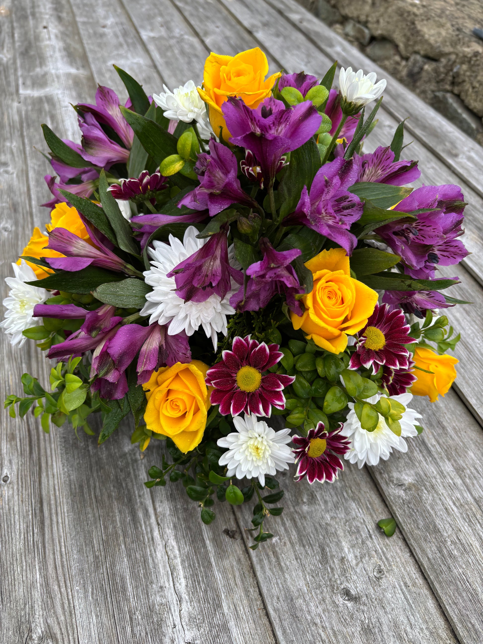Funeral Tribute Round Posy arrangement - lilac and Yellow with a touch of white.