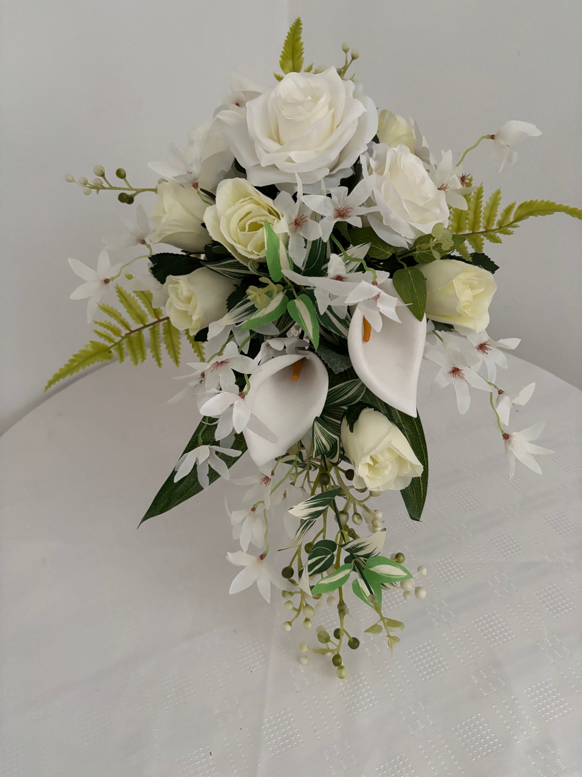 Silk artificial bridal shower bouquet of pale ivory rose buds, white open garden roses and lilies surrounded by blossoms, mixed greenery with eucalyptus.