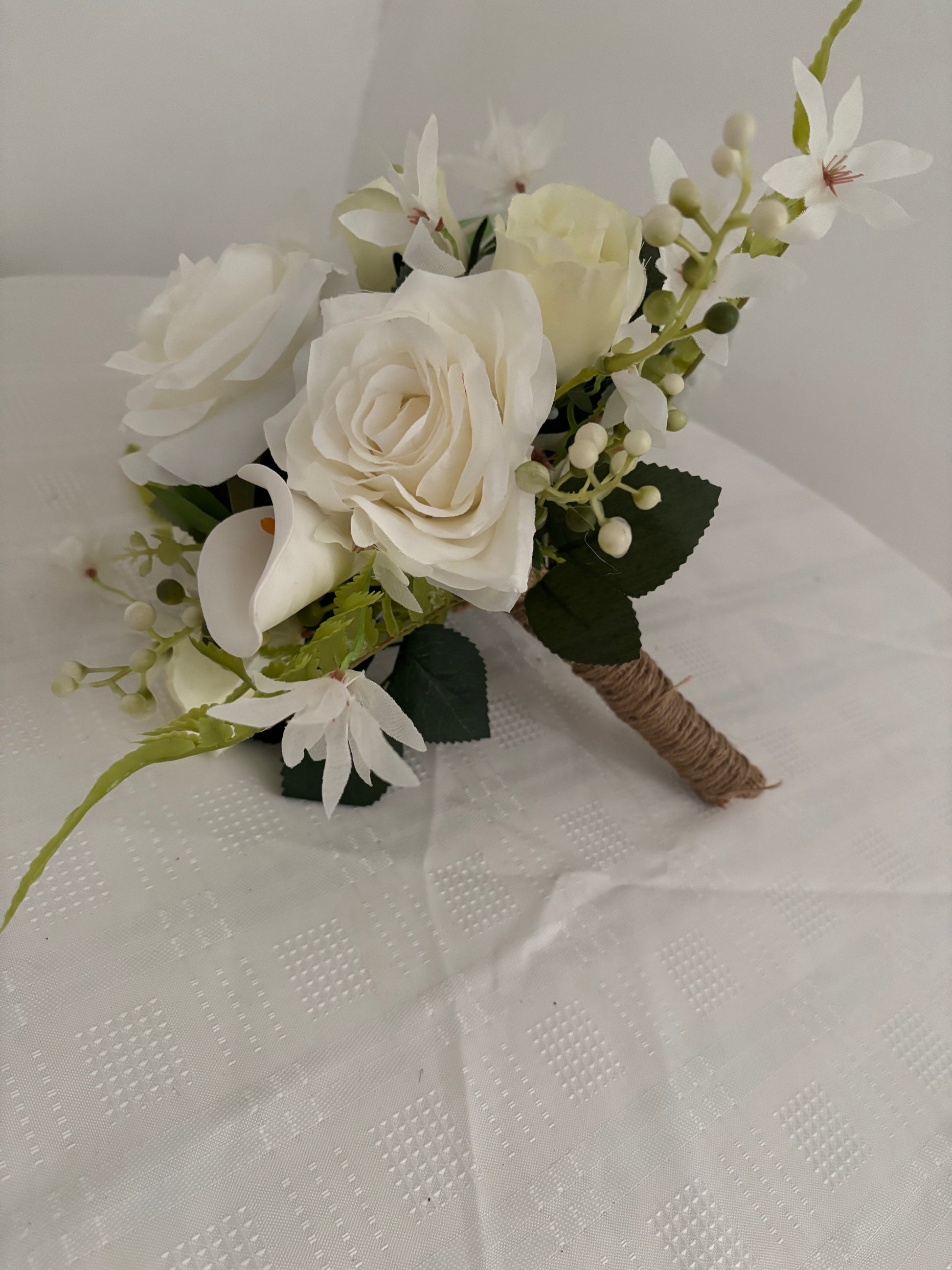 Large bridal shower bouquet of white open garden roses ivory rose buds and white Cala lilies surrounded with white blossoms and mixed greenery finished with a rustic hessian and jute handle.