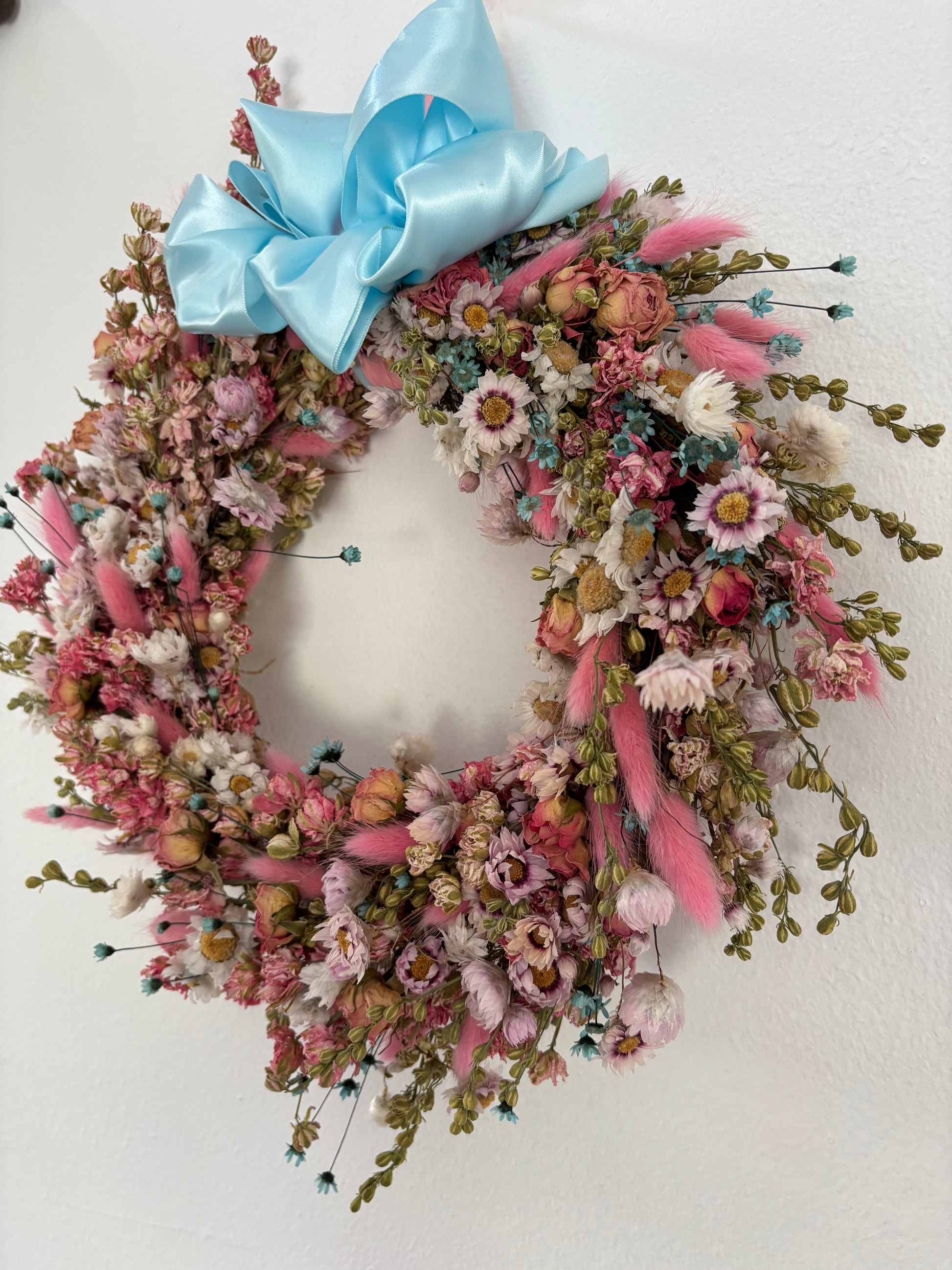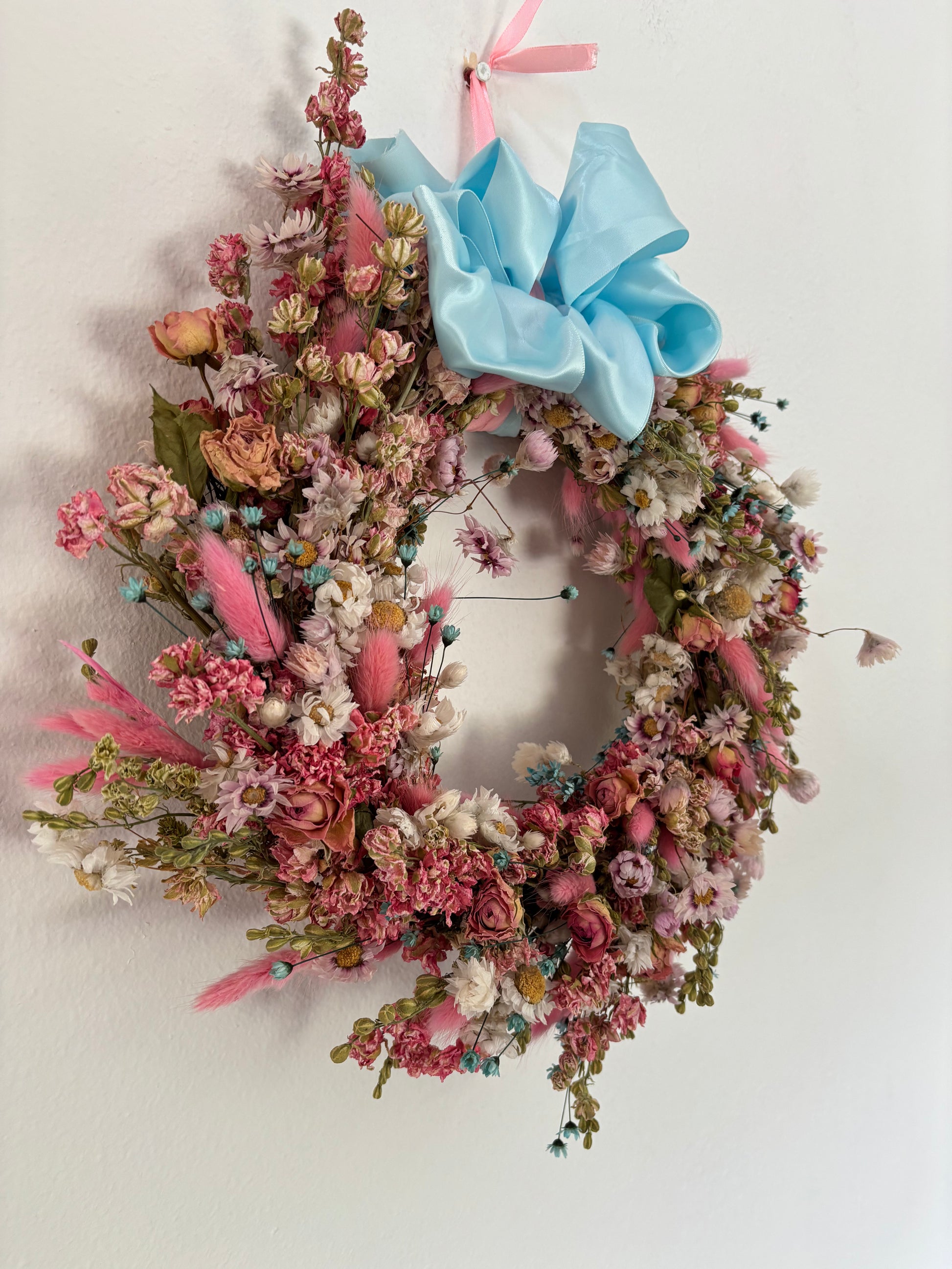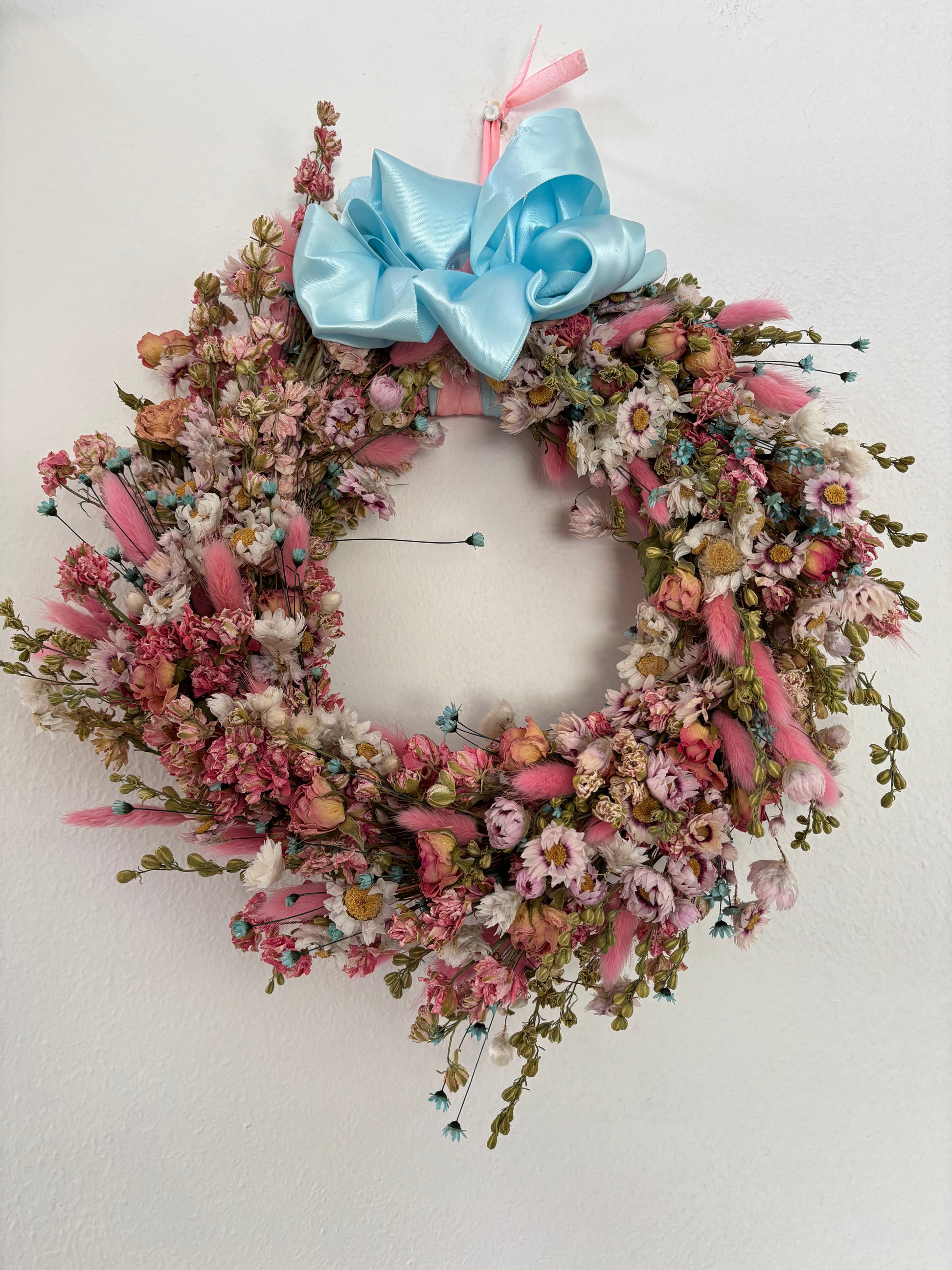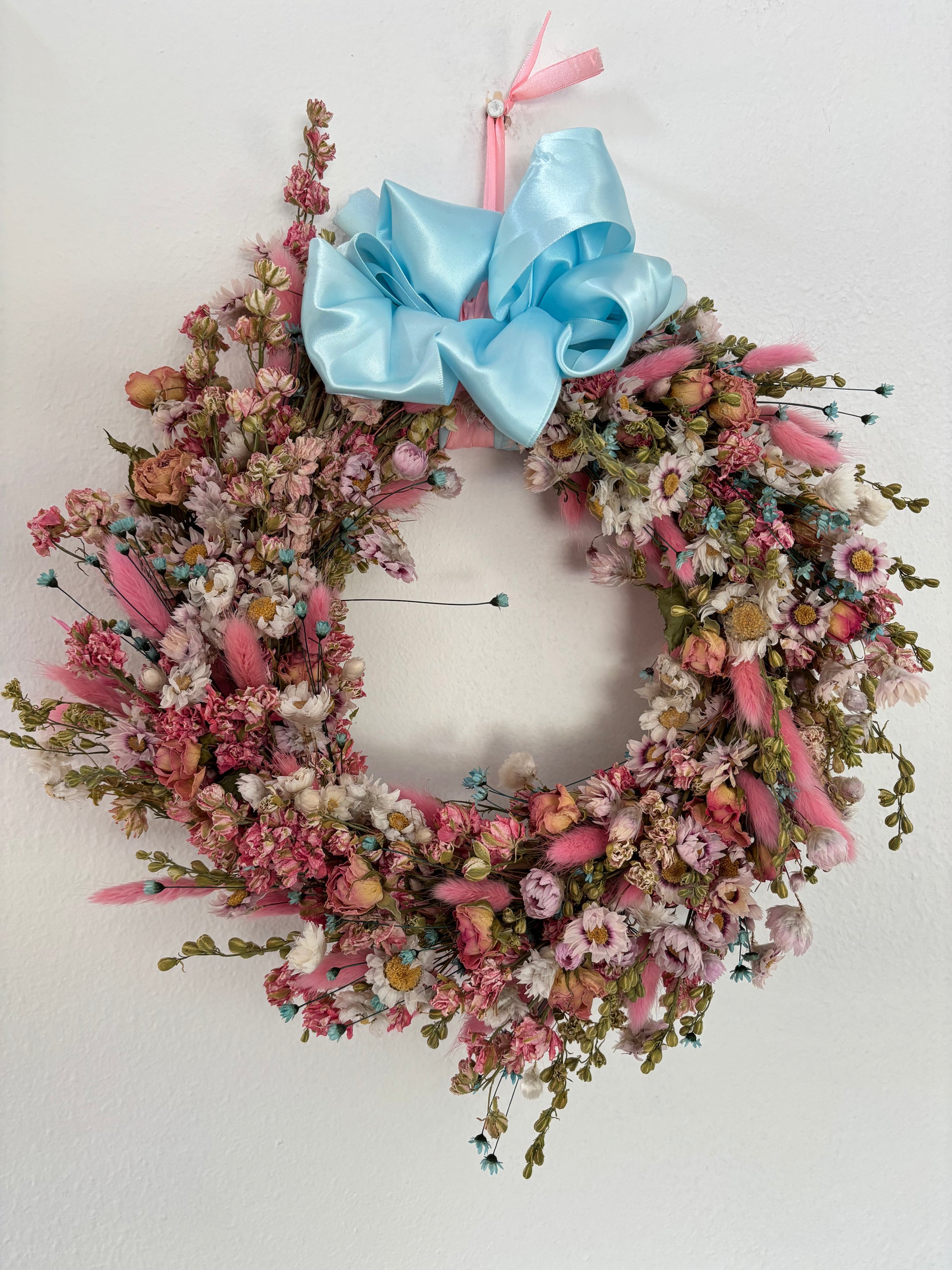 Natural Hanging Wall art Dried Flower Home decor Hand made round wreath decorated with dried and preserved flowers and greenery in delicate pinks and a hint of blue. Hand made on a straw base on a 10" metal frame. Finished with a blue and pink satin ribbon.