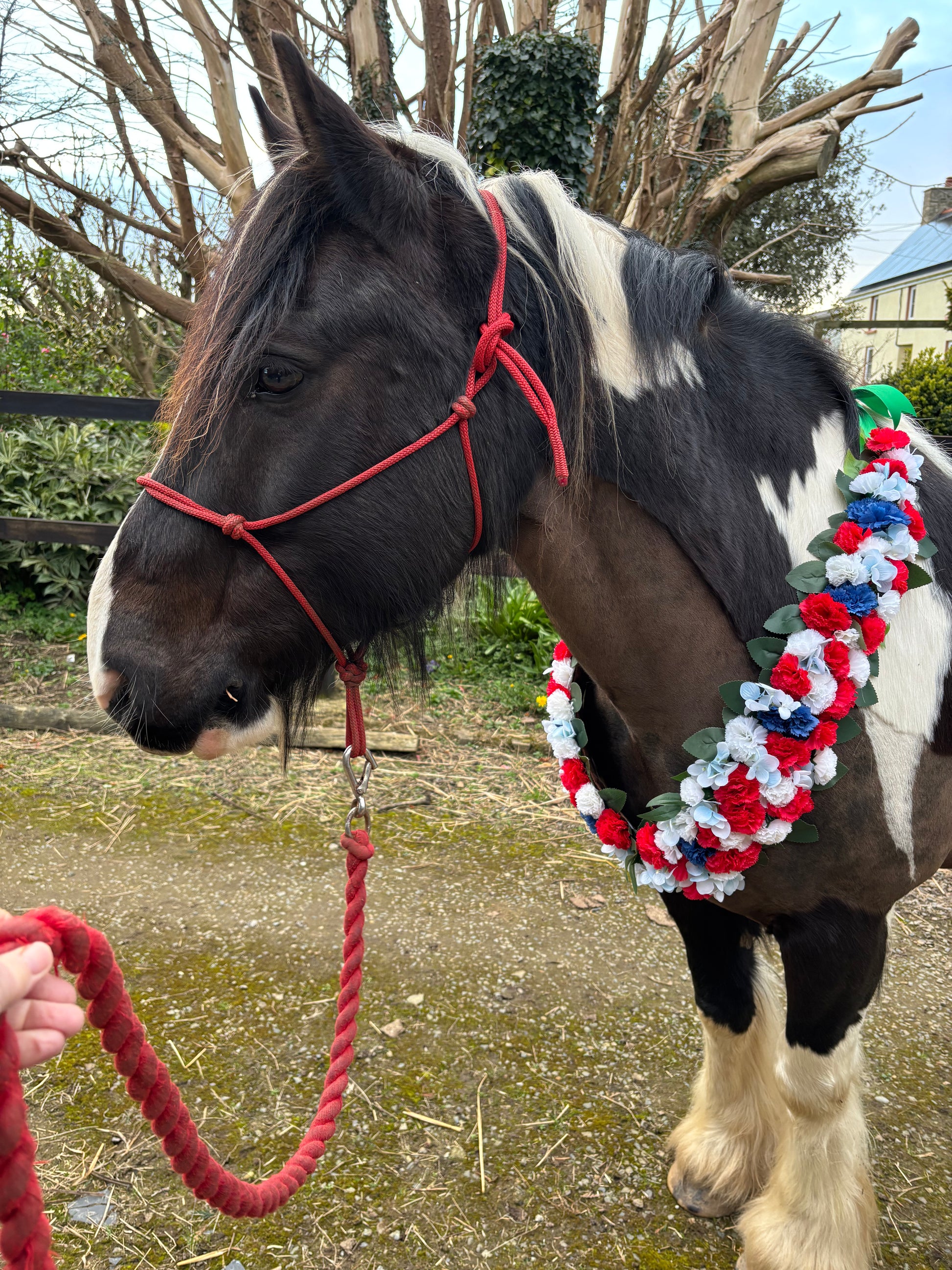 Floral horse or pony collar flower garlands hand created in winning colours of red, white and blue. Each garland is individually hand made so they are all unique and therefore the end product may differ slightly from the image shown.